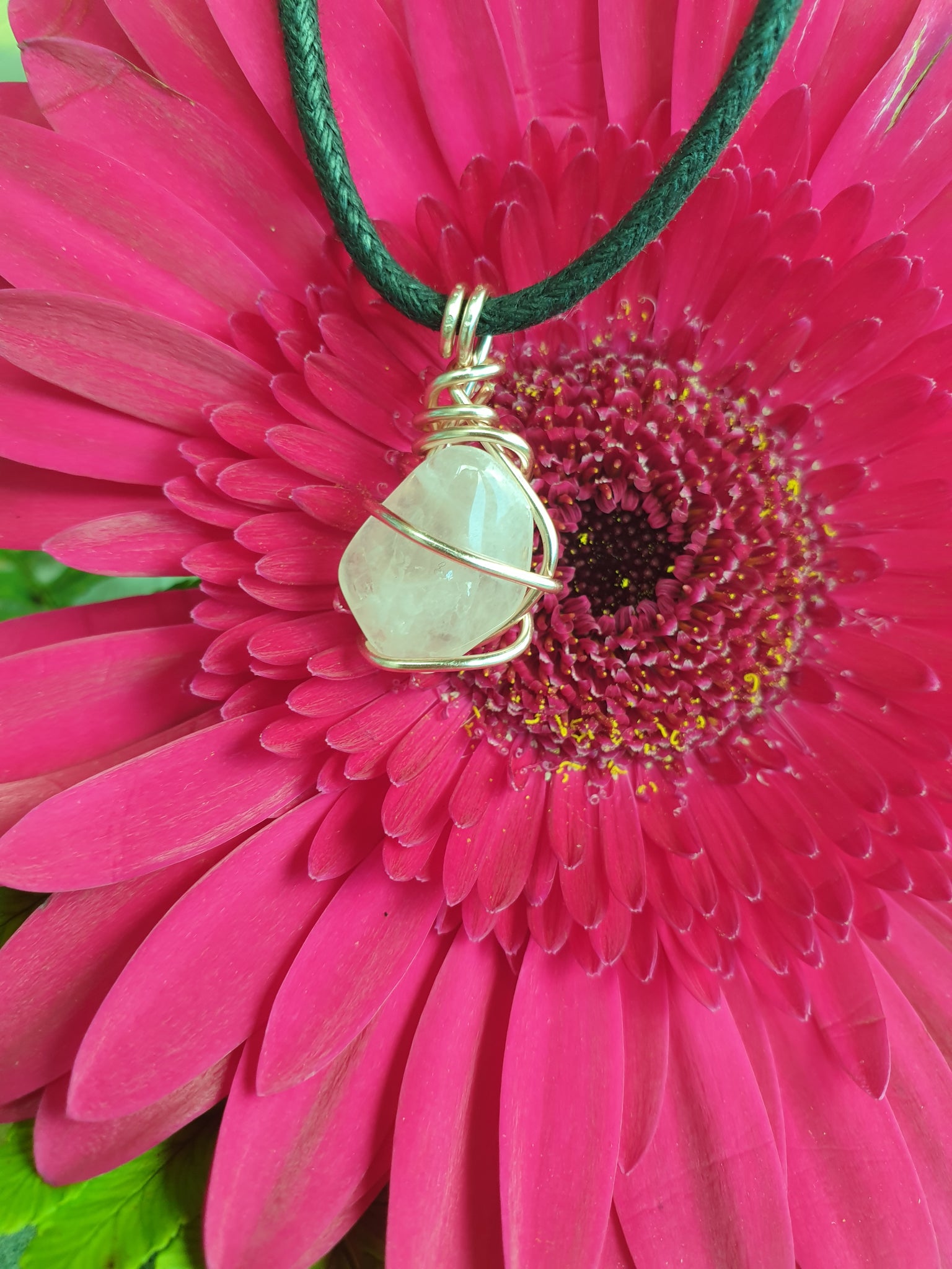 . Copper wrapped Rose Quartz pendant necklace on a double knotted waxed cotton cord. (1mm thick)
